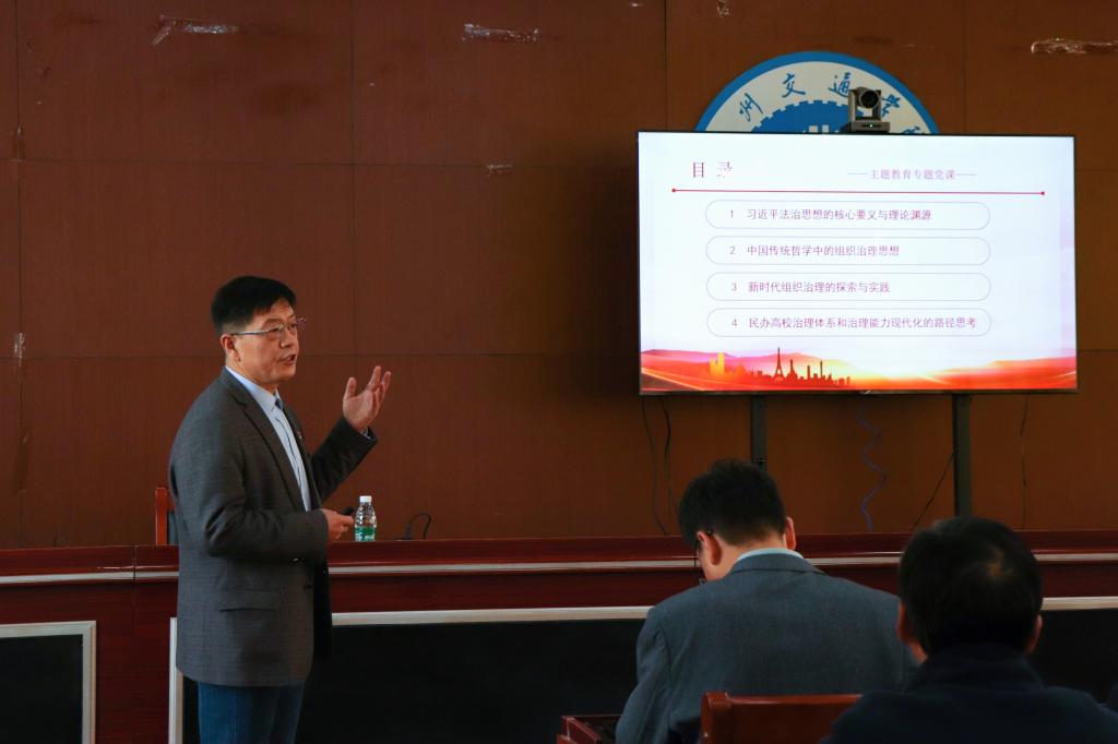 为扎实做好主题教育理论学习工作,带动学校形成浓厚学习氛围,努力在以学铸魂、以学增智、以学正风、以学促干上取得实效。我校党委书记庞更新在行政楼A512以“学习贯彻习近平法治思想 推进学校治理体系和治理能力现代化”为题,讲授了学习贯彻习近平新时代中国特色社会主义思想主题教育专题党课。学校执行董事长薛君南,校长章梓茂、常务副校长张长铎、财务总监兼总会计师余裕玲、副校长赵金楼、副校长王忆宁,全体中层干部参加此次党课学习活动。本次党课活动由党委副书记吴立军主持。
